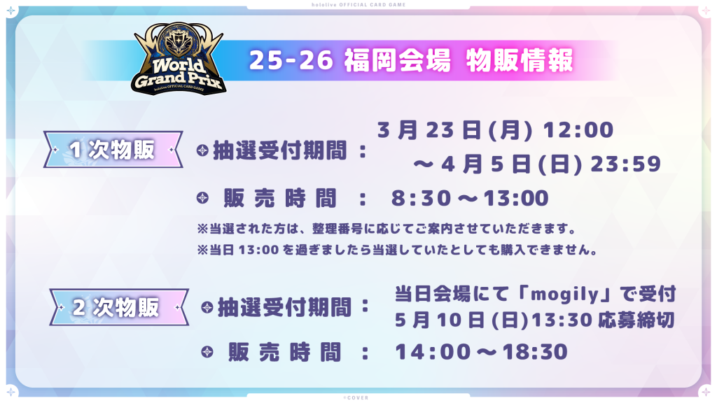 混雑を避ける為、「1次物販」と「2次物販」に区分し、それぞれmogilyでの事前抽選にて、販売対象者を決定させていただきます。