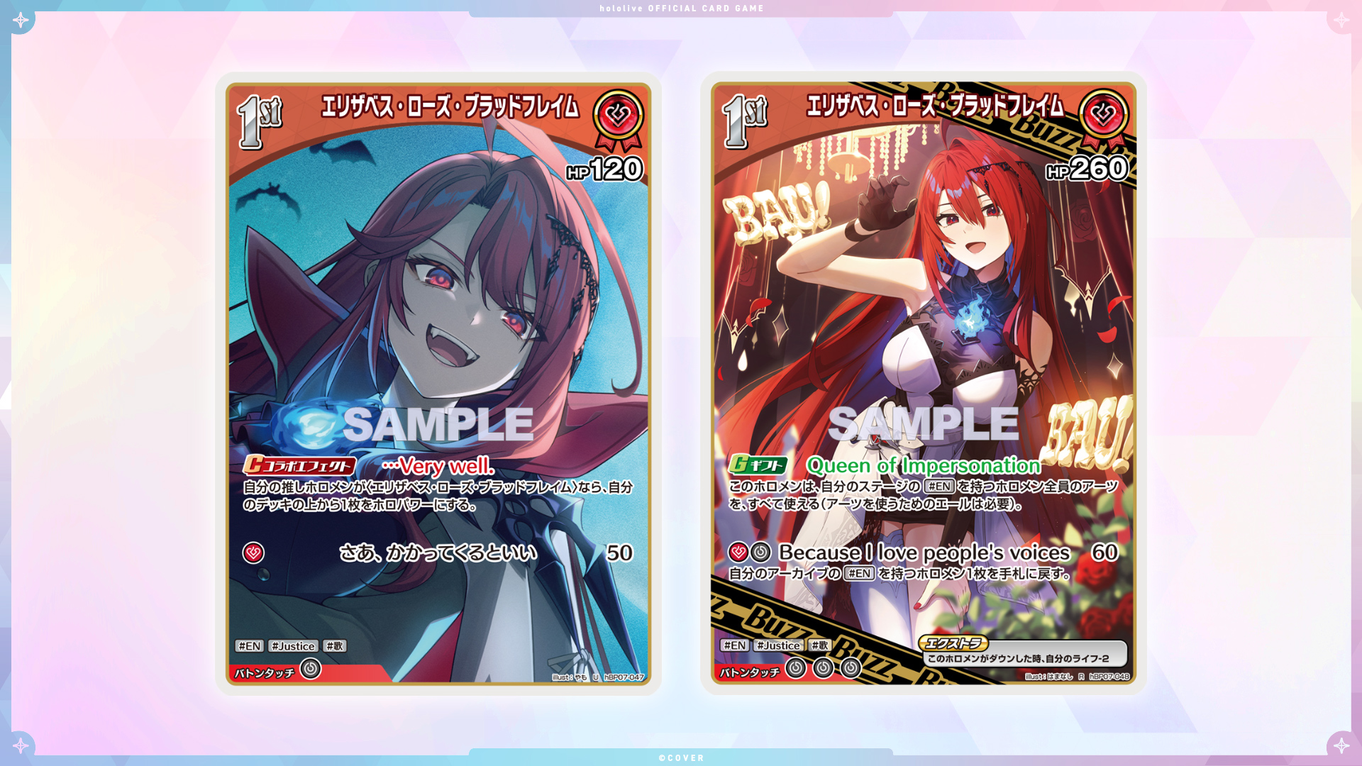 コラボエフェクト「Very well.」を持った1stホロメン、hBP07-047〈エリザベス・ローズ・ブラッドフレイム〉は「自分の推しホロメンが〈エリザベス・ローズ・ブラッドフレイム〉なら、自分のデッキの上から1枚をホロパワーにする。」という破格の能力を持っています!推しホロメンが持つスキルが両方ホロパワー:-3であるという課題を解決してくれる1枚ですね。1エールで50ダメージを与えられるアーツも小回りが利き強力です。