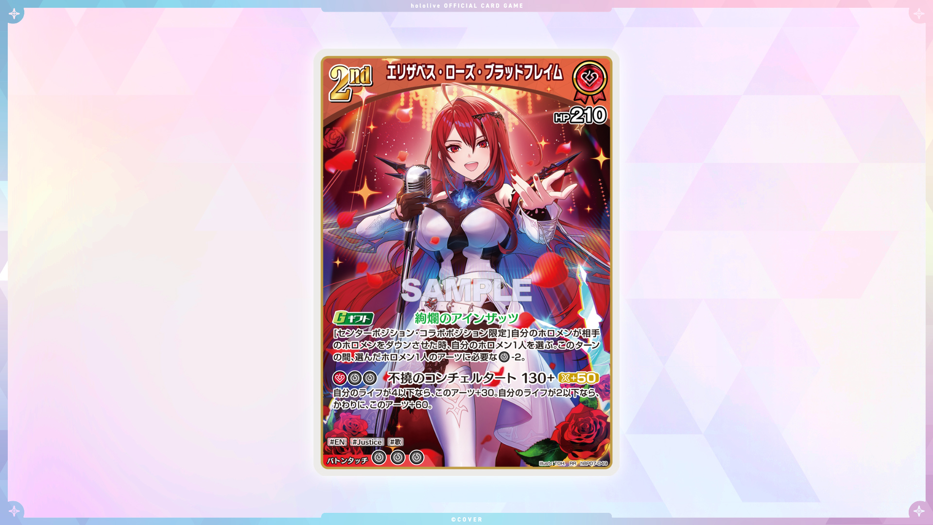 そして最後は2ndホロメンのhBP07-049〈エリザベス・ローズ・ブラッドフレイム〉です!『スタートデッキ 推し Justice』の2ndホロメンhSD13-007〈エリザベス・ローズ・ブラッドフレイム〉との相性抜群の1枚です。ギフト能力「絢爛のアインザッツ」は自分のホロメンが相手をダウンさせた時に選んだホロメン1人のアーツに必要な無色を-2することができます。この効果は自身を選ぶこともできるのでわずか1エールで強力なアーツを使用することもできるのです!