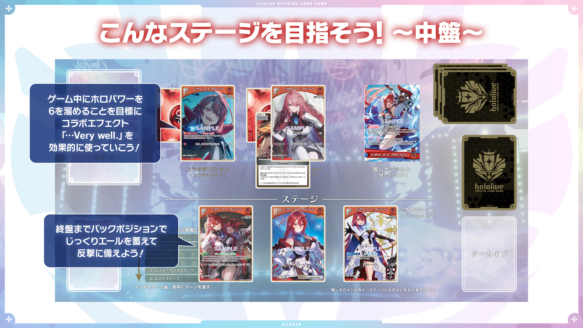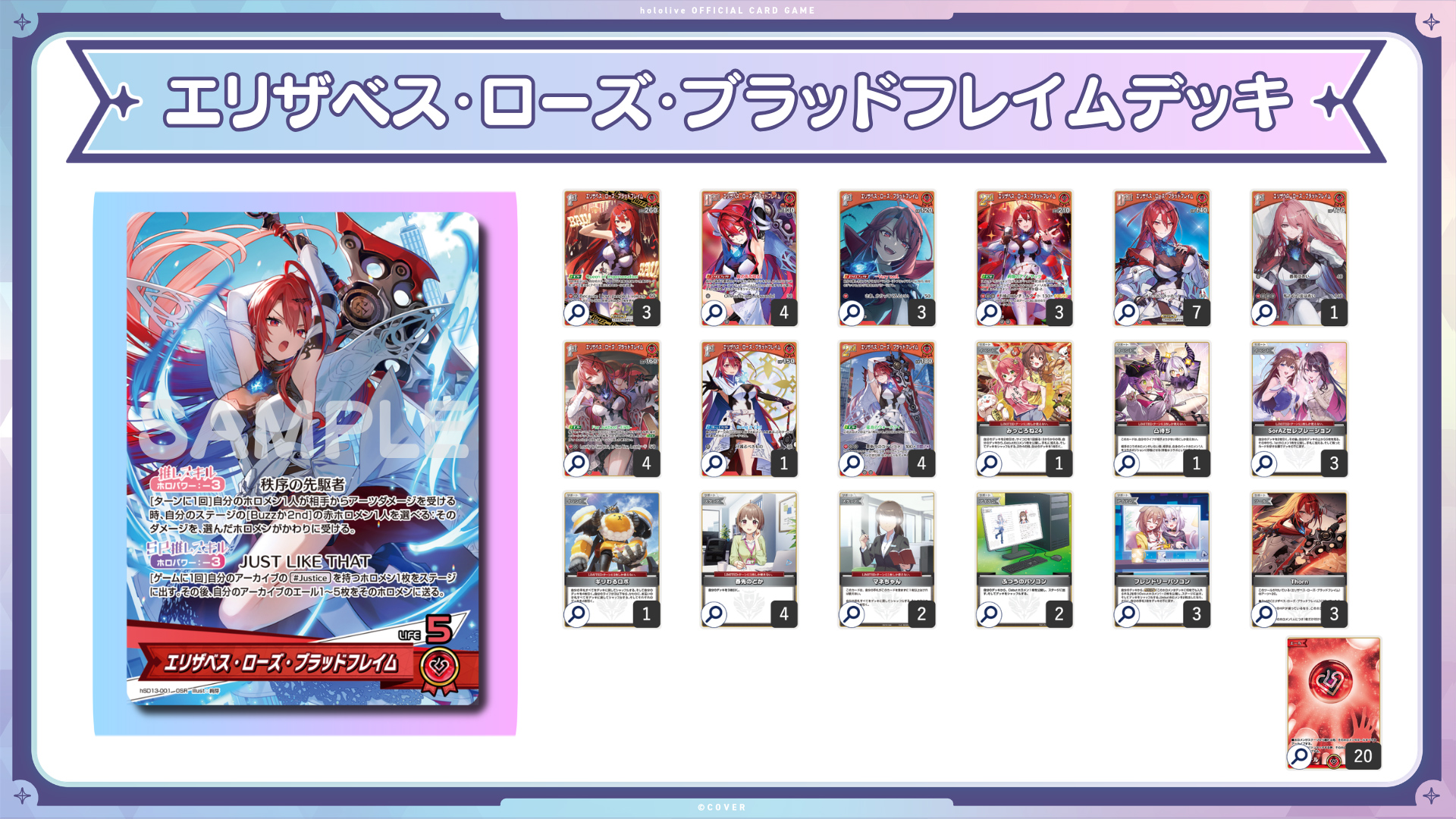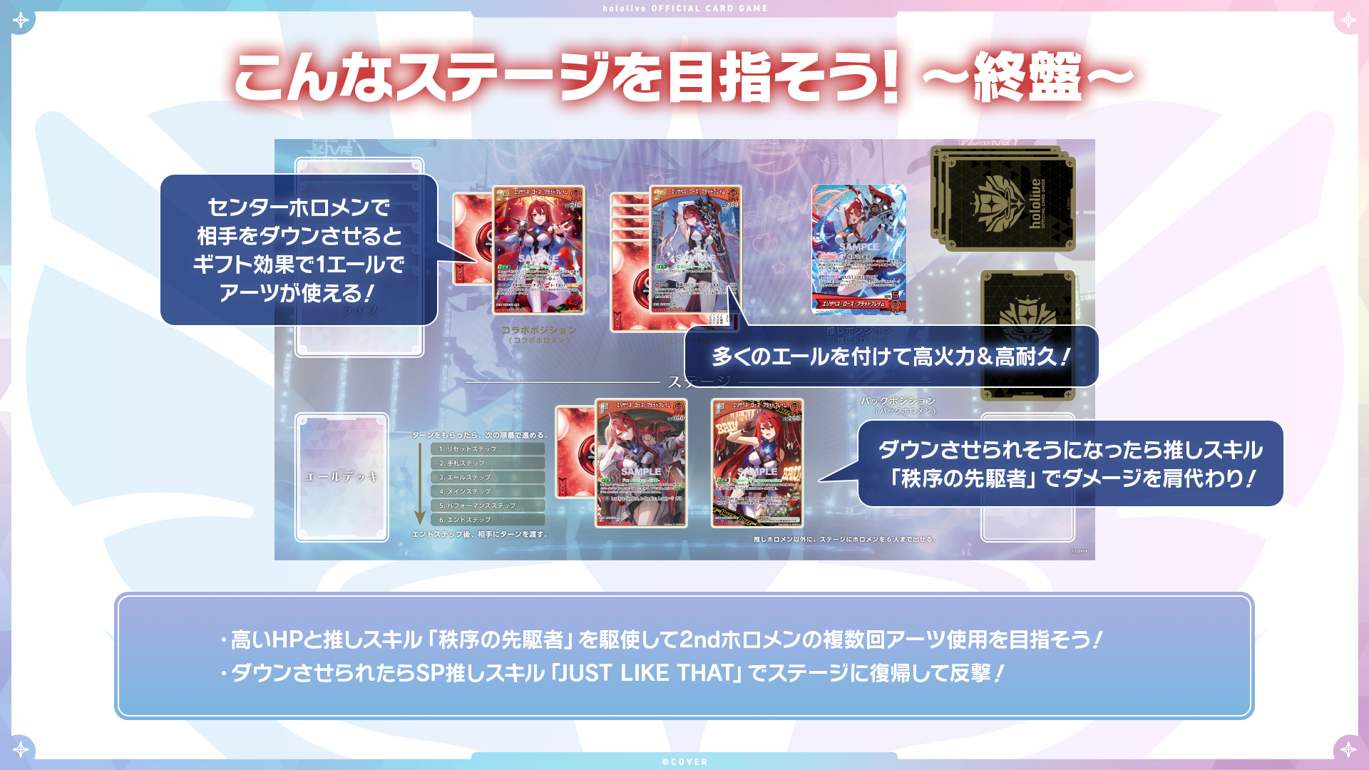 2ndホロメン達の圧倒的な攻撃力で相手ホロメンを一気にダウンさせてきます!センターポジションにhSD13-007〈エリザベス・ローズ・ブラッドフレイム〉、コラボポジションにhBP04-049〈エリザベス・ローズ・ブラッドフレイム〉を用意し、強力なアーツで大ダメージを与えていくのが理想的な布陣となります。