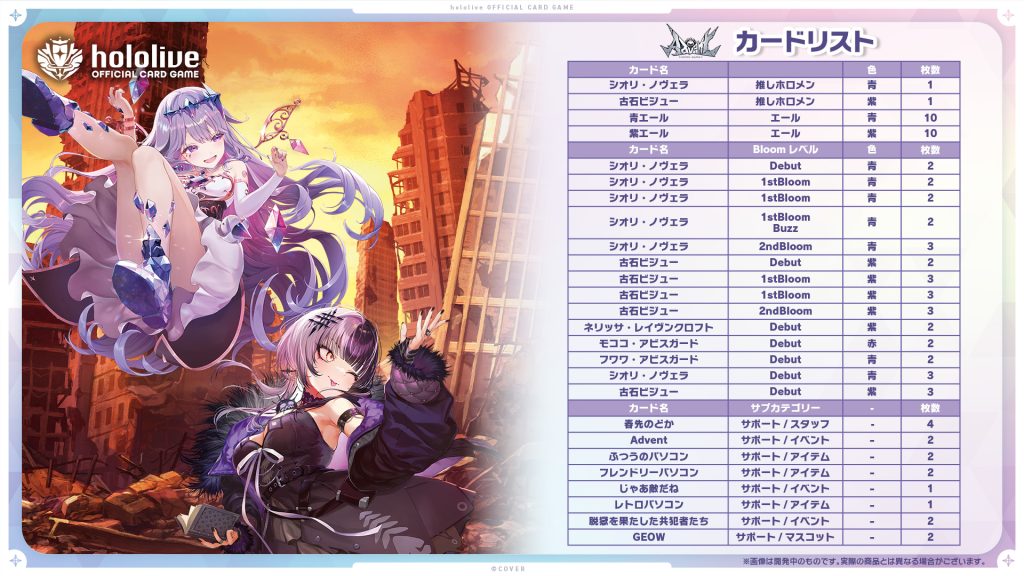 hololive OFFICIAL CARD GAMEに、ホロライブEnglishから「Advent」と「Justice」がスタートデッキで登場!